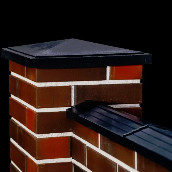 Cтильные колпаки коллекции BonaMono в насыщенном чёрном цвете гармонично выделяют столбы, придавая забору аккуратный и современный вид. Вместе с колпаками применены парапеты серии Bona, которые надёжно защищают кирпичную кладку от воздействия осадков и продлевают срок службы конструкции. Такое решение не только улучшает декоративное восприятие ограждения, но и обеспечивает практичную долговечность, сохраняя архитектурную целостность объекта.